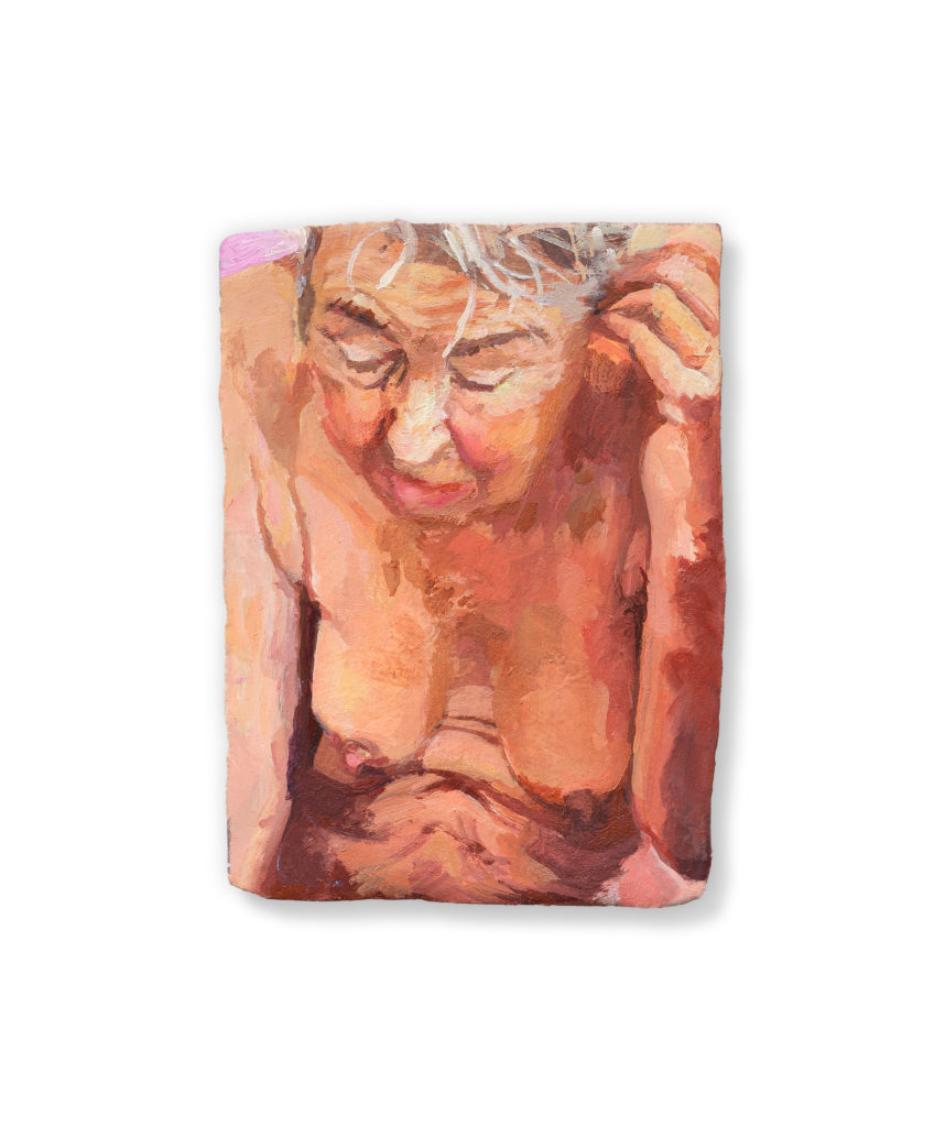 La Galerie Ariane C-Y invite le visiteur à expérimenter différentes échelles. Les sculptures monumentales de Guillaume Castel dialoguent avec les huiles sur ardoise de Clémentine Margheriti (1981), dont certaines tiennent au creux de la main, comme le portrait Nue de sa grand-mère centenaire. Clémentine Margheriti appartient à cette génération de peintres figuratifs français qui renouvelle le genre. Pour Art Paris, la galerie sélectionne ses œuvres en lien avec l’œil et le regard. Agathe accueille le spectateur de son œil droit laissé en réserve tandis que Nine semble empêchée de voir par une poussière logée dans son œil. En 2023, l’artiste était sélectionnée pour l’exposition itinérante Voir en peinture, La jeune figuration en France. Son travail interroge le glissement entre le réel, l’image photographique et la peinture. L’ardoise, support singulier, concentre l’intensité de son geste pictural dans le petit format. Quatre de ses œuvres ont intégré les collections du FRAC Alsace et deux huiles celles du MASC des Sables-d’Olonne en 2025.